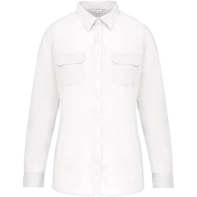 French front (no front placket) French-style shirt neck Chest and back fitted darts Cuff openings with button closure (two positions) Spare button