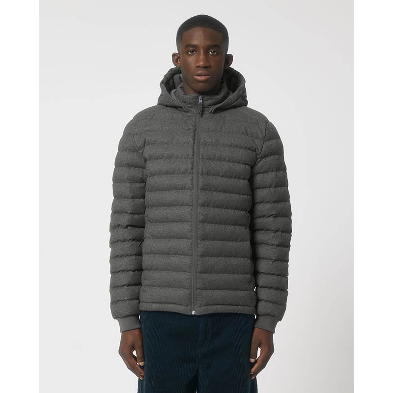 Padded winter jacket. Reversed waterproof zipper at center front and side pockets. Side pockets finished together with the seam of the jacket on the inside, so they can be used as inner pockets as well. Adjustable press button closure at bottom sleeves. Hood adjustable with elastic cords on the sides, finished with an elastic tape at the seam.