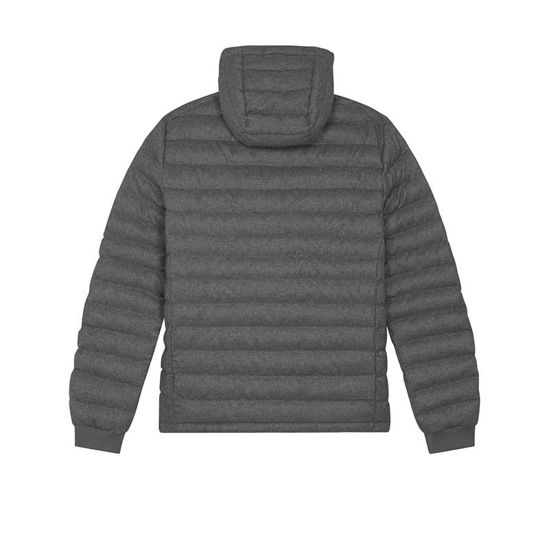 Set-in sleeve High collar with detachable hood with matte metal hidden snaps Hood opening and bottom hem with adjustable plastic stopper and elastic cord Reverse nylon zip at center front Zipped welt pockets with extra grosgrain puller Fully qu