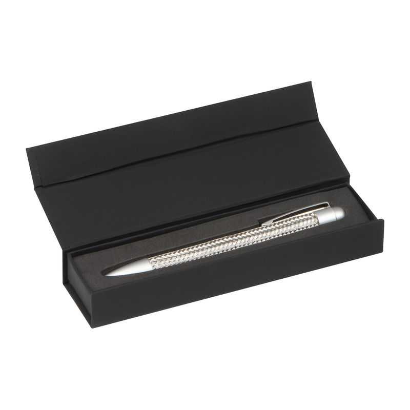 Exkluzivní kuličkové pero s koženým křížkovým vzorkem okolo spodní části těla. Včetně náhradní, prémiové, černé náplně a zabaleno v "LUXE" dárkové krabičce (16x4,5x2,5 cm).