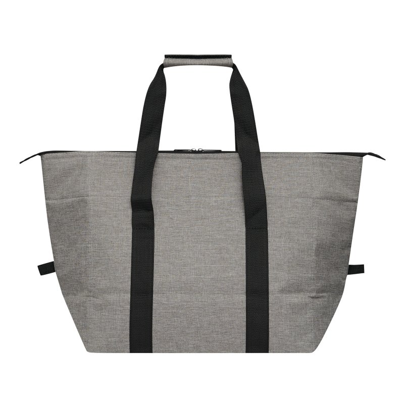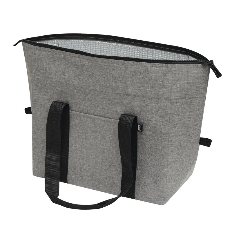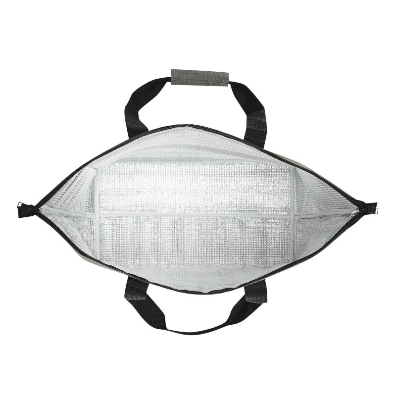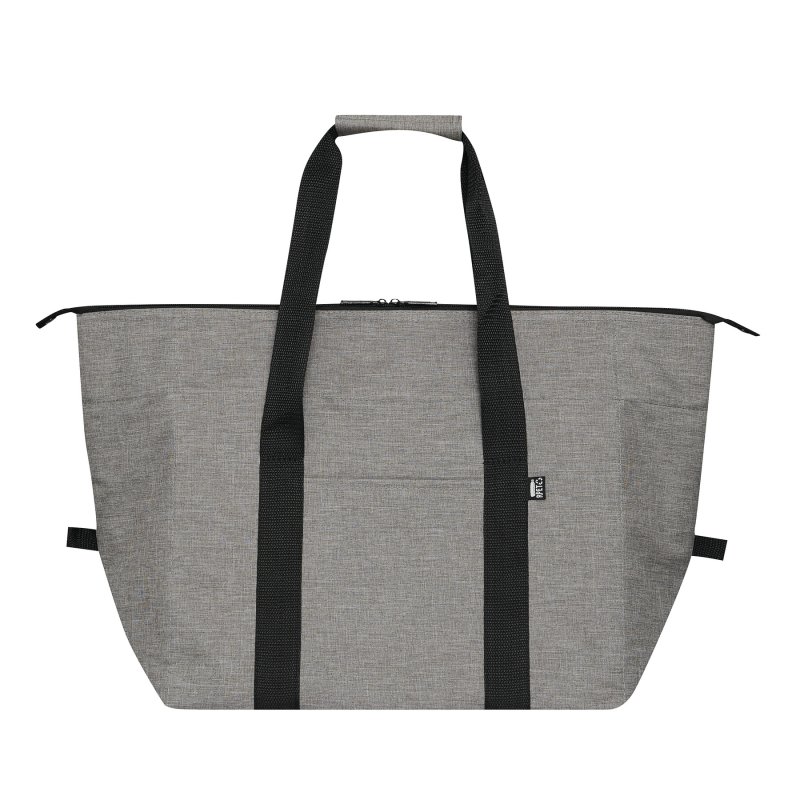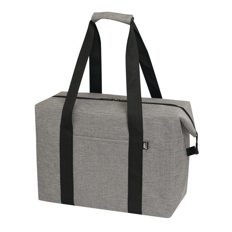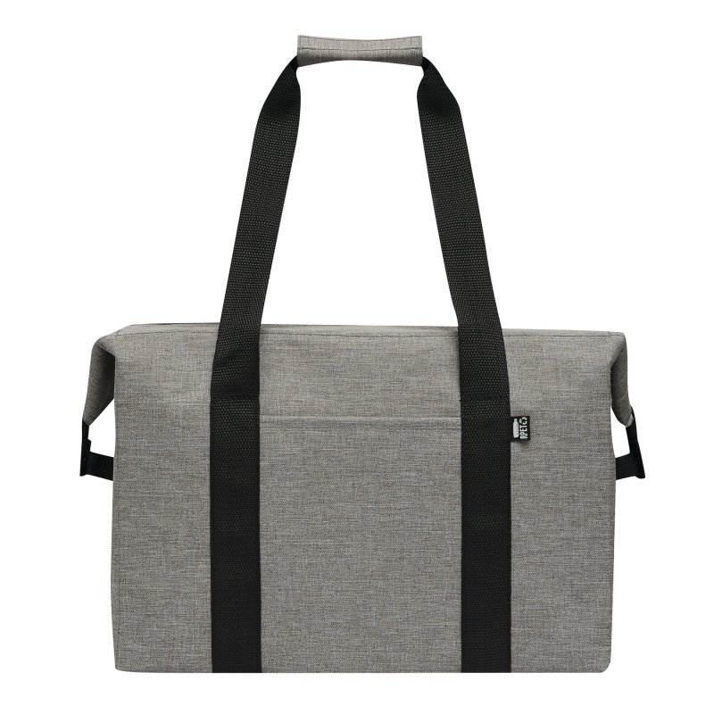 RPET cooler bag with aluminium foil inside. Two zippered compartments. Including carrying strap.