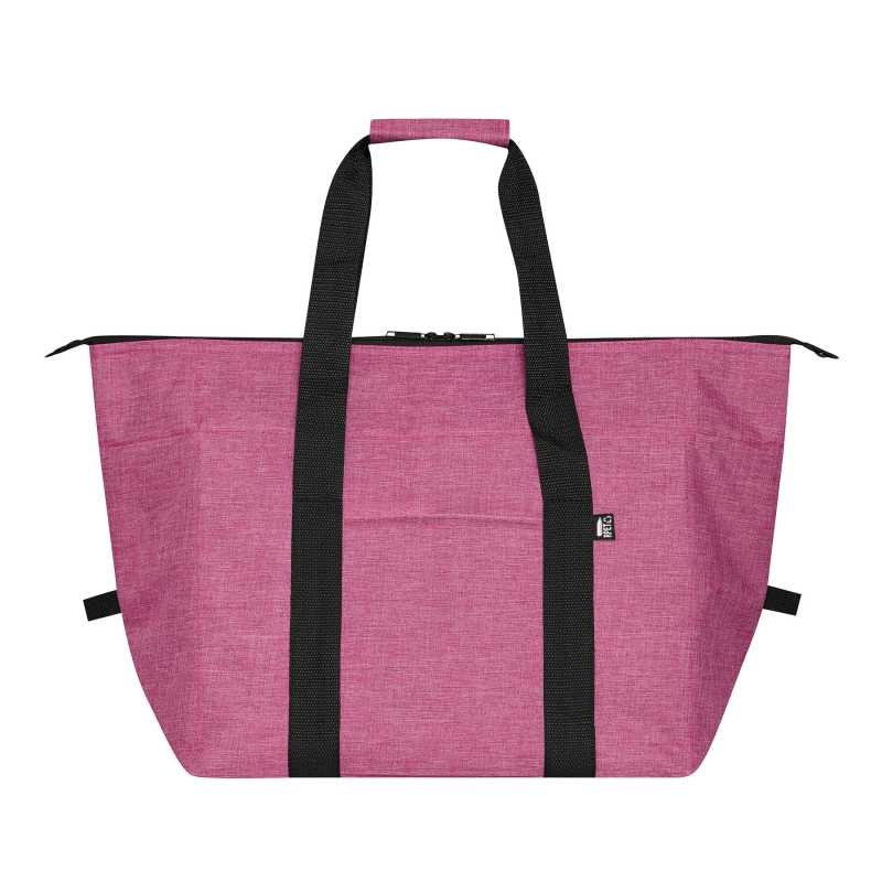 NOVINKA 2025. Cooler bag in durable 600D RPET polyester made from recycled plastic, to encourage the reuse of plastic waste and contribute to the sustainability of the planet. Main compartment in mesh, with zipper closure. Base with integrated cooler, manufactured in resistant 600D RPET polyester, with PEVA isothermal inside. Reinforced carry handles and large front pocket, with RPET emblem on outside label.