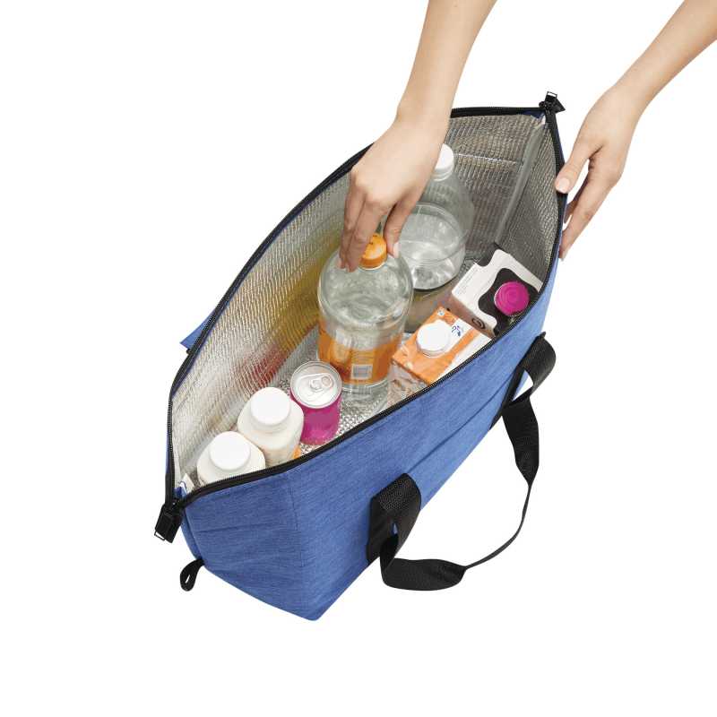 Chladiaca taška z 600D RPET polyesteru s PEVA výstelkou, s 2 priehradkami na zips a nastaviteľným ramenným popruhom. S výrazným štítkom RPET.