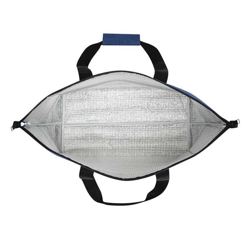RPET cooler bag with aluminium foil inside. Two zippered compartments. Including carrying strap.