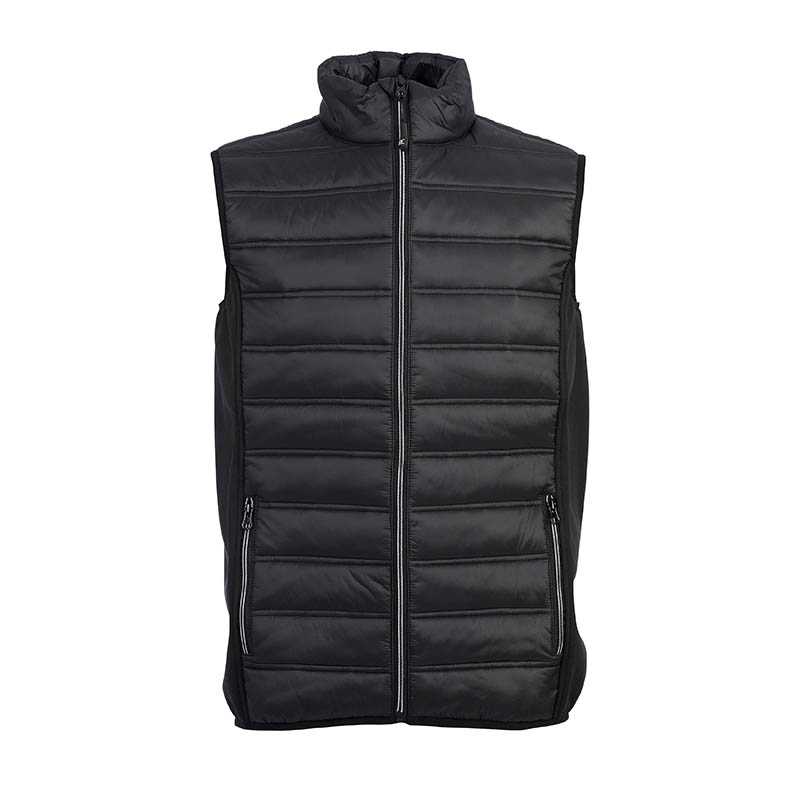 NOVINKA 2025. WAISTCOAT IN COMPOSITE FABRIC - Main fabric in soft 310T nylon taffeta with water-repellent treatment. - Polyester padding - Polyester lining with mesh on the side front and polyester in the back - Secondary fabric on shoulders and hips in black 3-layer softshell in 95% polyester - 5% elastane, Waterproof 8000 mm/H2O Breathability 1000 g/M2/24h anti-pilling fleece interior - YKK taped zippers - Two external zip pockets - One chest pocket with taped zip refractive - Reflective piping along the rear side - Internal neck reinforcement tape with coat hanger - Central zip with internal windproof fabric - Fabric to protect the chin - Elastic fabric in the armholes and at the hem