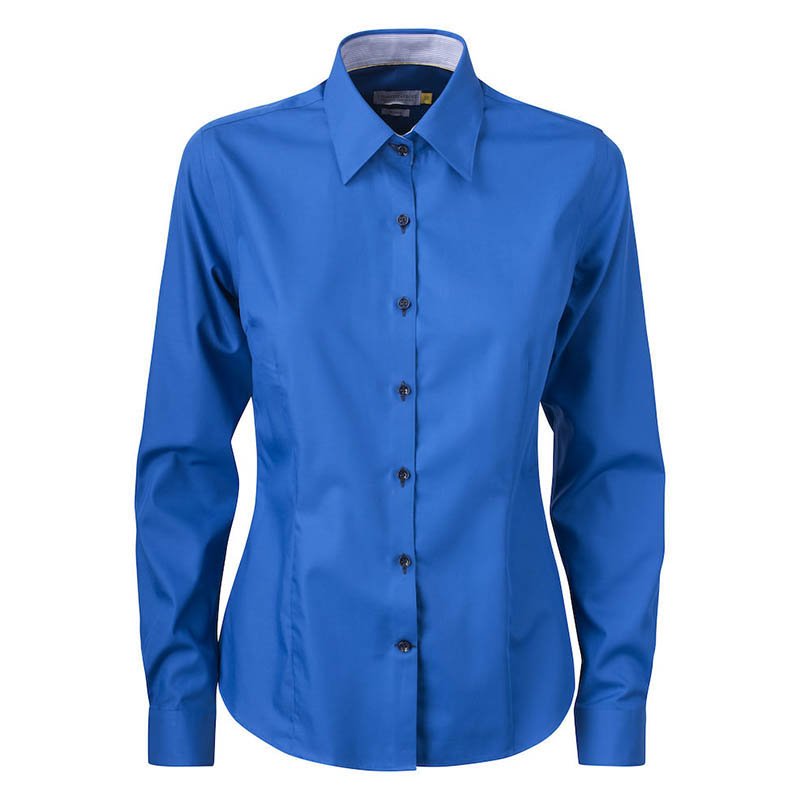 High quality ladies shirt in combed cotton. Shirt in easy care treated fabric and enhanced lining seams, collar and sleeve ends. Body in check pattern with contrast fabric under collar, placket, sleeve and necktape. Modern fit with cutting seams at back. • 100% Cotton • 513 LIGHT BLUE , 613 NAVY, 913 GREY • XS-XXL