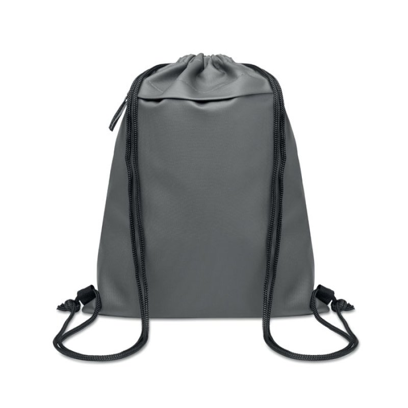Synthetic fibre drawstring backpack. The entire backpack is highly reflective. The attachment rings are made of copper.