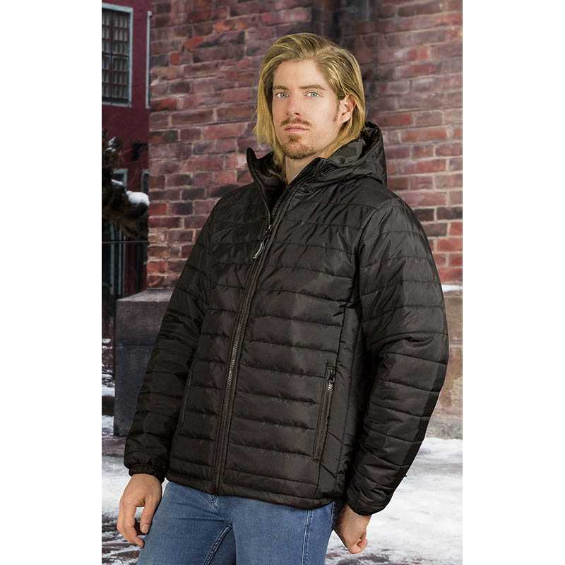 Quilted Hooded Jacket with Thermal Effect. Made of water-repellent flat weave outer Loft fabric, smooth inner lining and inner quilting for ensuring excellent thermal insulation through channels. Stand-up double layer collar with full-zip front closure including a chin guard for warmth and comfort. Straight-cut waist with adjustable elastic drawstring and stopper for a better fit and added comfort. Two vertical zippered waist pockets and an inner velcro pocket for a secure and convenient storage.Includes an inside back zip for easy marking with different methods: screen printing, embroidery, transfer printing, shields, vinyl application. Ideal as promotional clothing and casual wear.