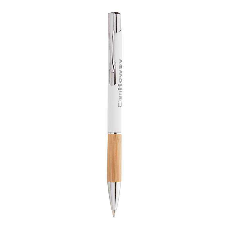Hliníkové guľôčkové pero s bambusovým úchopom, pogumovaným povrchom a modrou náplňou. So špeciálnou vrstvou na zrkadlové laserové gravírovanie.
