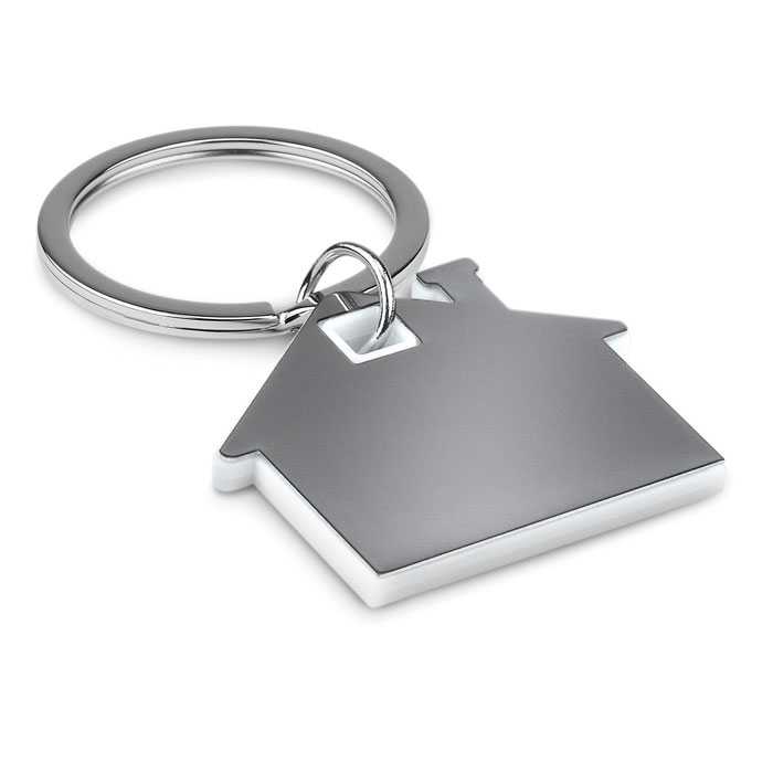 Přívěsek na klíče ve tvaru domu z nerezu a ABS plastu.