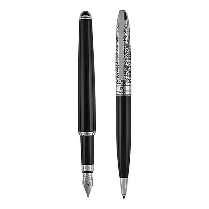Značková súprava kovového guľôčkového a plniaceho pera Pierre Cardin. Výrazná kombinácia čierneho tela a strieborného vrchnáku s osobitým tmavým rytím latinky do povrchu. Guľôčkové pero obsahuje kvalitnú modrú náplň s hrotom 1 mm a náhradnú čiernu náplň, plniace pero obsahuje 1 ks atramentu v modrej farbe. Balené v luxusnej krabičke Pierre Cardin, dodávané s certifkátom pravosti. Odporúčaná technológia potlače: gravír, kartička. Maximálna veľkosť potlače: 40 × 5 mm. Rozmery: guľôčkové pero 1 × 14 cm; plniace pero 1 × 14 cm; balenie 17,5 × 6,7 × 3,5 cm. Kartónové množstvo v ks: 20.