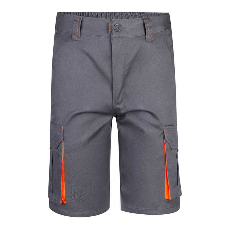 NOVINKA 2025. Stretch multi-pocket short trousers - Main fabric 65% polyester - 33% cotton - 2% elastane - Stretch anti-abrasion fabric 92% polyester - 8% elastane on the thighs - Triple stitching - Two front zip pockets with reflective tape - One side pocket with zip - One open back pocket - One rear zip pocket with reflective tape - Double side pocket for tools or ruler - Hammer holder hook - Elastic waist on the hips and increased loops - PVC key ring or badge holder hook - Covered snap button at waist