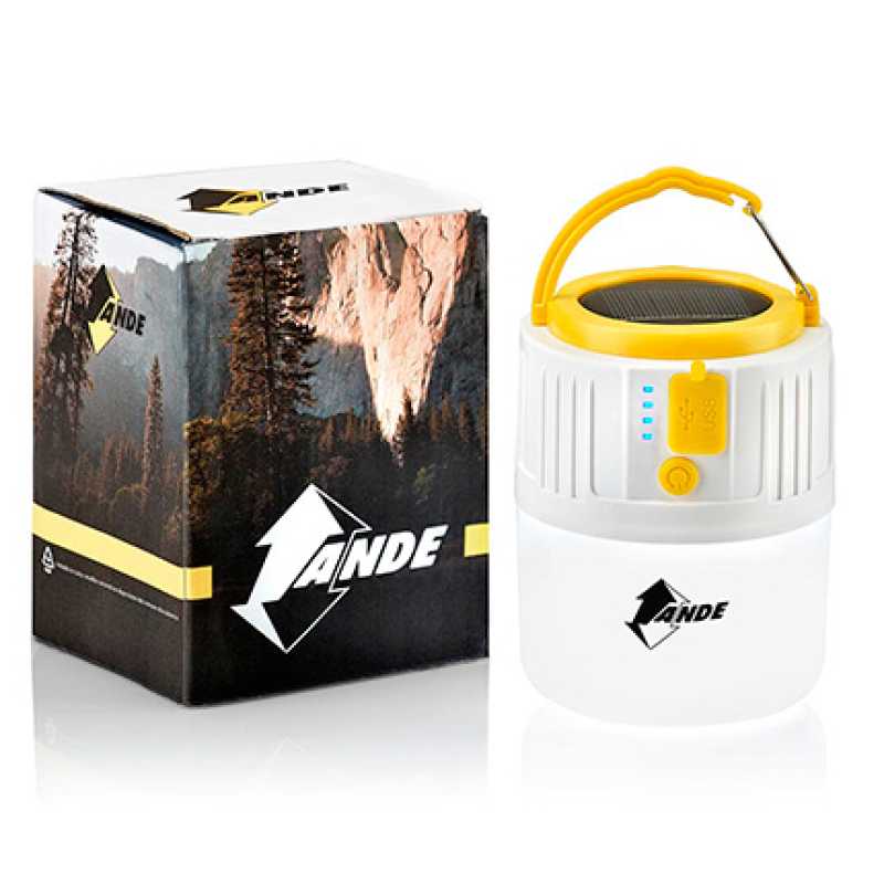 Camping LED light with solar cells ANDE in a box. Charging function: USB – 5V – 1°A. Material: PC, Battery capacity: 2400mah, Power 10W, Voltage: 3,2 – 4,5V. Size: 12x9x9 cm.