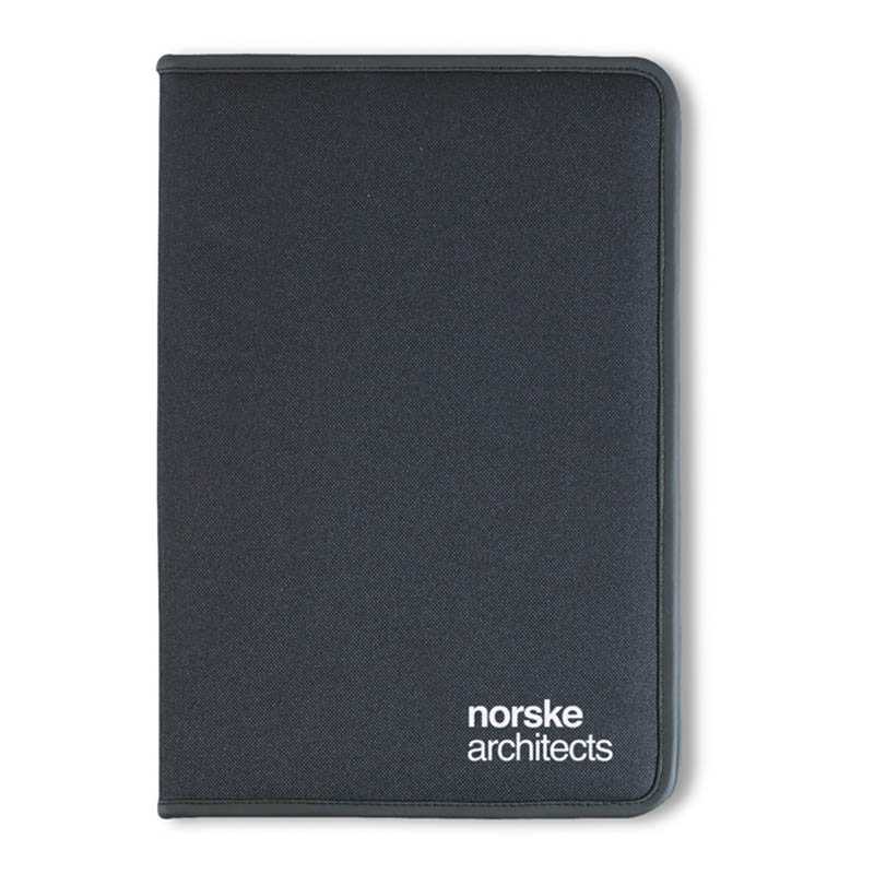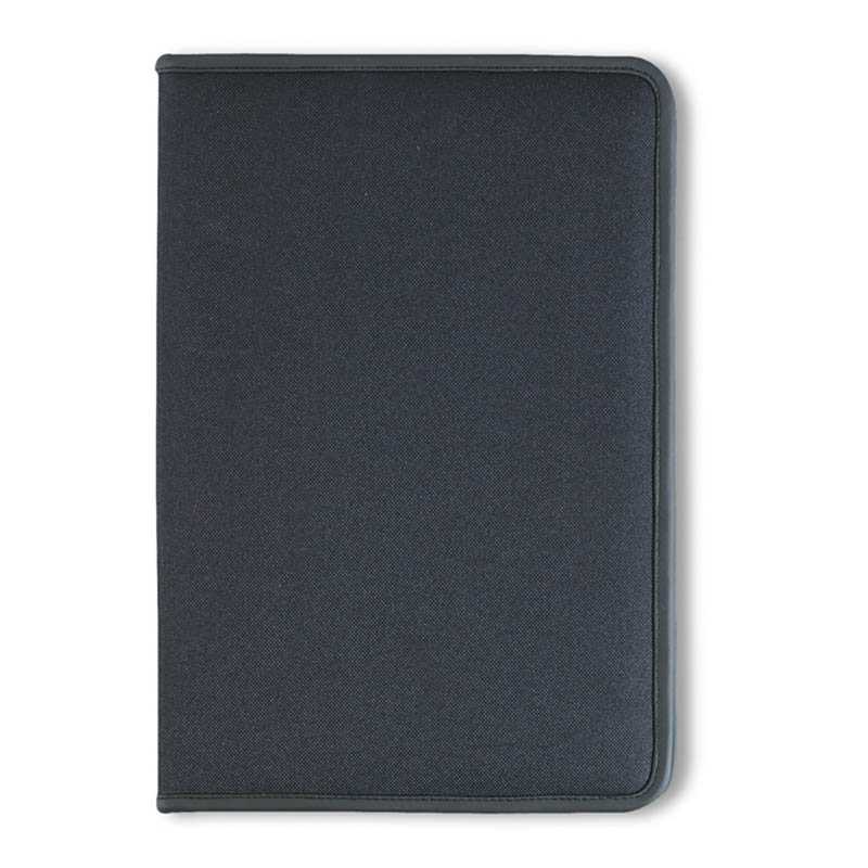 Konferenční A4 desky z polyesteru se zipem. Vnitřní kapsy a držák tužky. Včetně 20ti stránkového linkovaného bloku.