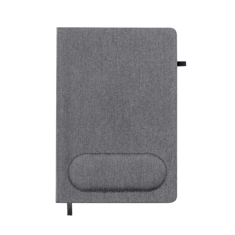 NOVINKA 2025. Notepad with integrated mouse pad on the cover. Manufactured in RPET 300D, with rigid covers and a comfortabe wrist pad so it can be used as a mouse pad. Including bookmark and matching color pen holder. 100 plain inner sheets and is available in an elegant grey colour. With RPET logo on the back cover and presented in an individual recycled bag.RPET material is made from recycled plastic, thus promoting the reuse of plastic waste and helping the sustainability of the planet.