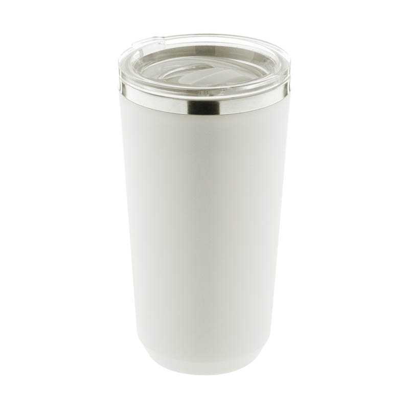 PP plastom pokrytý dvojstenný, nerezový termo hrnček s viečkom na pitie. 500 ml.