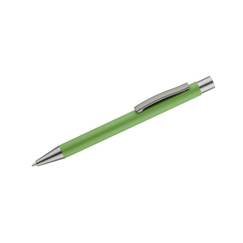Tenké pogumované kovové guľôčkové pero v rôznych farbách so striebornými aplikáciami a čiernou náplňou.