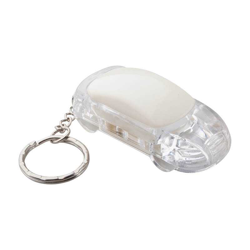 Plastový prívesok na kľúče v tvare auta s 1 LED diódou a kovovým krúžkom, vrátane gombíkovej batérie.