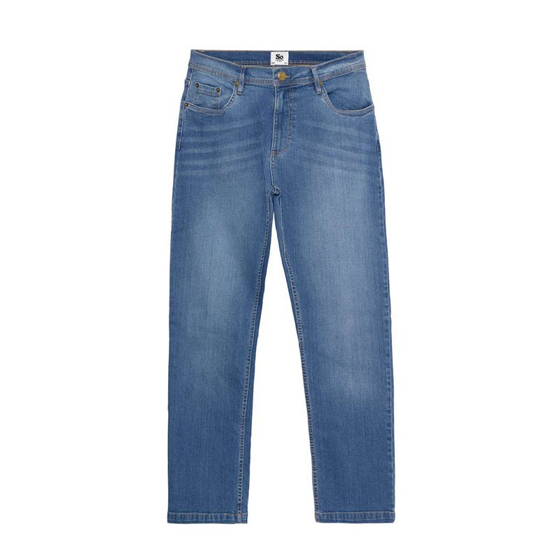 99 % bavlna/1 % elastan.Rovný strih.Strečový denim.Štýl s 5 vreckami.Zapínanie na narážací gombík a zips YKK.Kovové nity v rohoch vreciek.Detail prešívania dvojitým prešívaním.Látkové pútka na opasok.