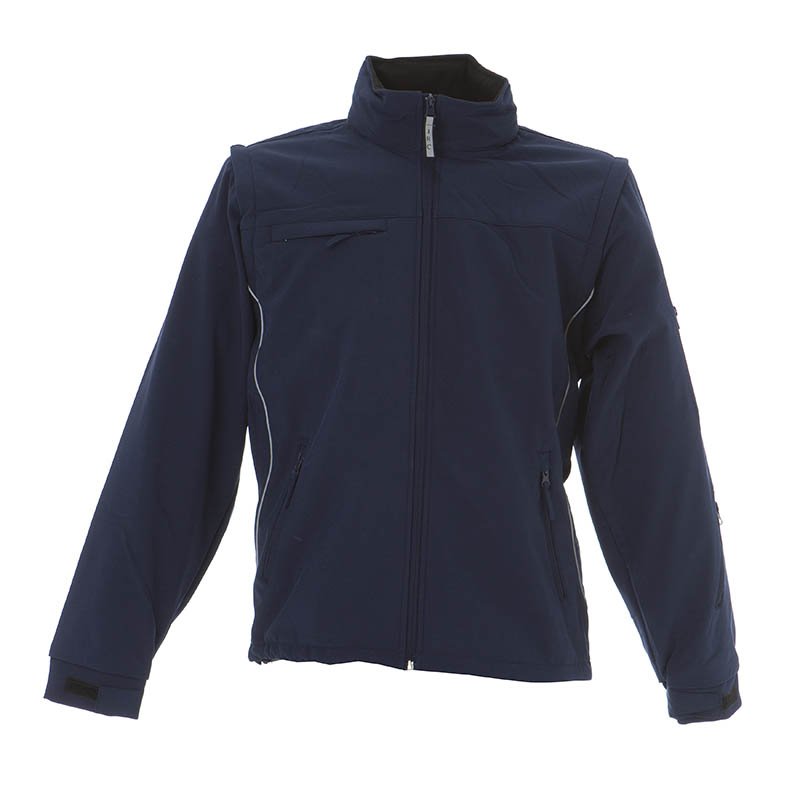 "Soft shell jacket waterproof and breathable - 92% Polyester - 8% elastan - Waterproof 6000 mm/H2O - Resistance to moisture g/m2/24h 4000 - Detachable sleeves - Pull-out hood - Reflective thin band on the sides - Covered zippers - One chest pocket with zip"