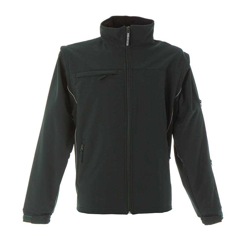 "Soft shell jacket waterproof and breathable - 92% Polyester - 8% elastan - Waterproof 6000 mm/H2O - Resistance to moisture g/m2/24h 4000 - Detachable sleeves - Pull-out hood - Reflective thin band on the sides - Covered zippers - One chest pocket with zip"