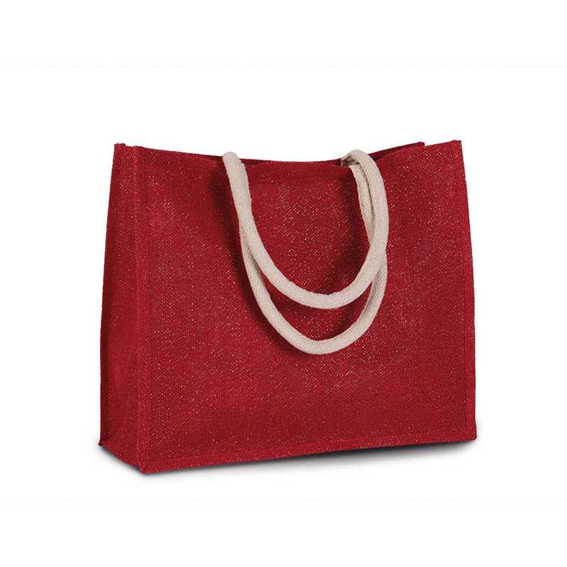 Jute bag with plastic backing, a cotton front pocket, and padded carry handles.