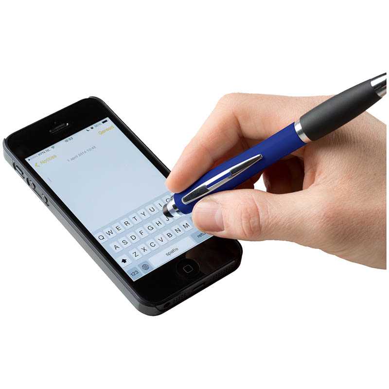 Blue ink ballpoint pen with coloured barrel, rubber grip, glossy accents, recess in metal clip and rubber top/pointer to operate touch screens (eg iPhone/iPad).