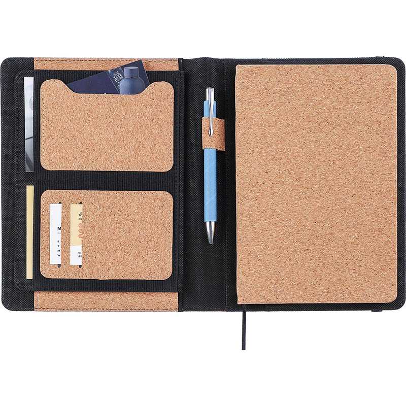 NOVINKA 2025. Cork portfolio, approx. A5 size. With inside pockets, elastic closure band, pen loop, and removable A5 notebook with 192 lined recycled paper sheets (70 gsm). Packaged in tissue paper.