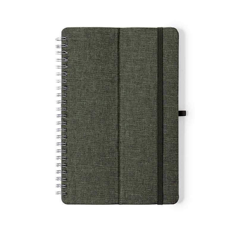 NOVINKA 2025. Nature line ring binder notebook. Hard covers made in resistant RPET 300D material, made from recycled plastic. With original smartphone and tablet holder integrated in the cover and made of wheat straw. Including elastic closure and matching pen holder. 70 pages inside with single-stripe layout and available in a wide range of colors. With RPET logo on the back cover and presented in an individual recycled bag.