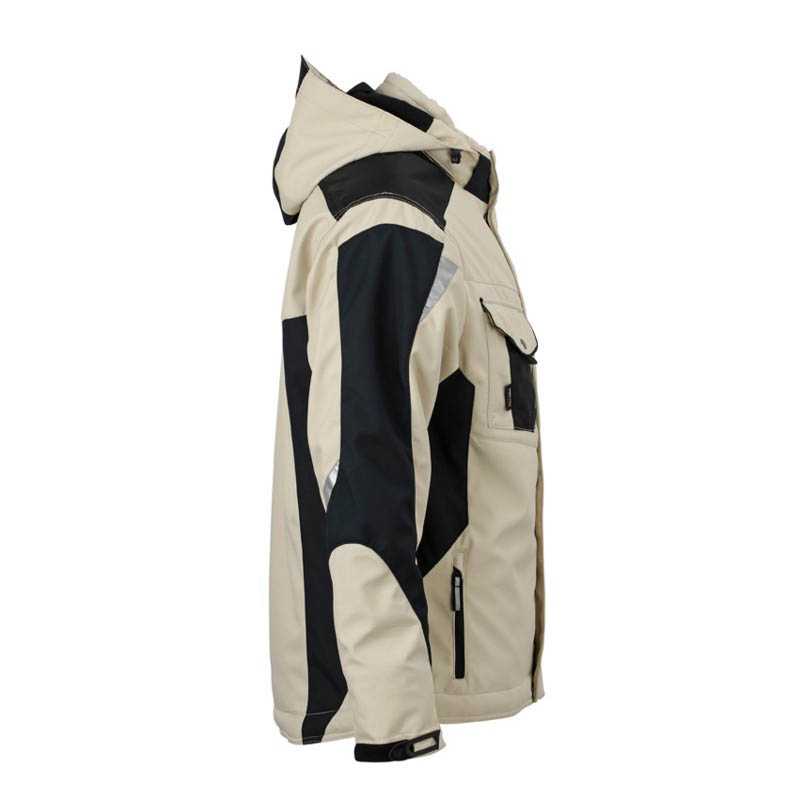 3vrstvový softshell s membránou, vodeodolný, vetruodolný a priedušný materiál, rovný strih s bočnými švami, celozapínací reverzný špirálový zips s krytkou brady, lemy rukávov nastaviteľné suchým zipsom, dolný lem na stiahnutie elastickou šnúrkou, vrecká s
