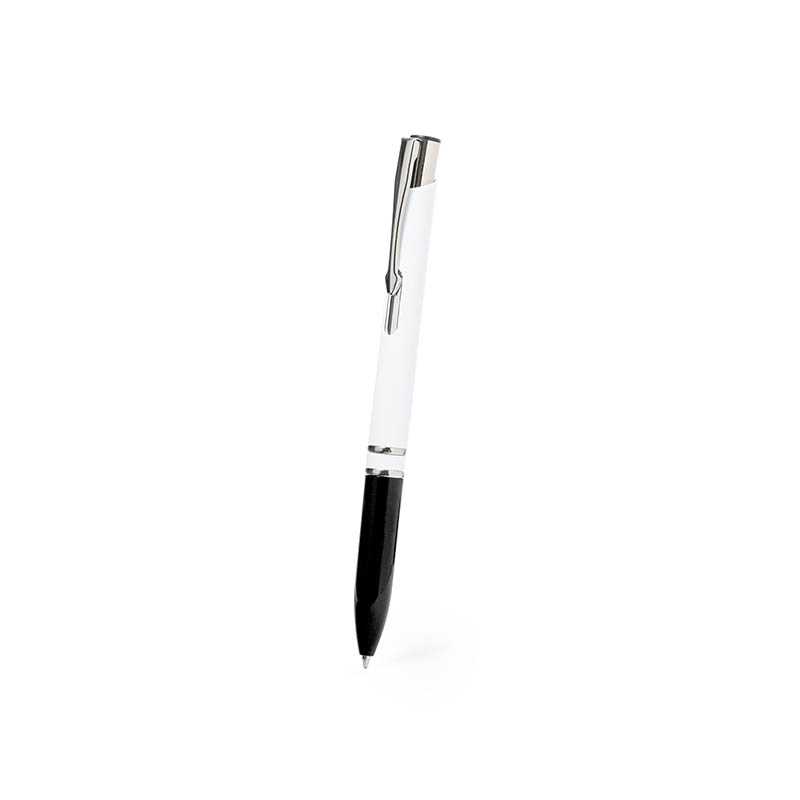 NOVINKA 2025. Elegant ball pen with push-button mechanism. With body finished in gloss white and grip in a wide range of colours. Made of durable ABS with glossy finish. Jumbo cartridge and blue ink.