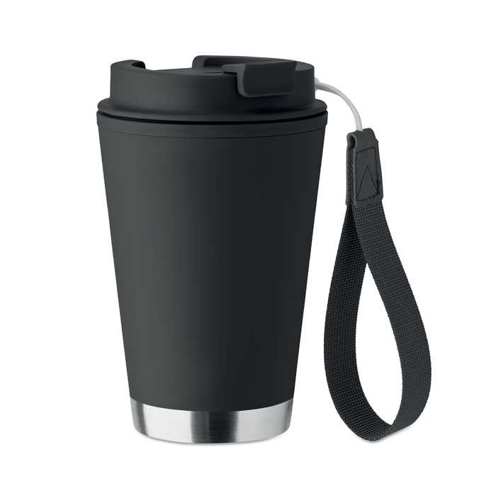 Dvoustěnný pohárek s vnitřní stěnou z PP, vnější stěnou z recyklované nerezové oceli a páskem na zápěstí z RPET. Objem: 300 ml.