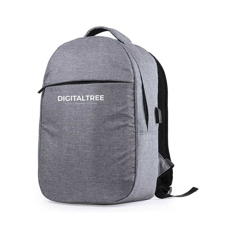 NOVINKA 2025. Security backpack in an urban design and in resistance 300D polyester material. Inside pocket with RFID (Radio Frequency Identification) security technology that keeps card and other devices data safe. Main compartment with an elegant zipper cover. With USB connection -powerbank not included and inside, padded pocket for laptops up to 15 inches. Padded backside and shoulder straps.