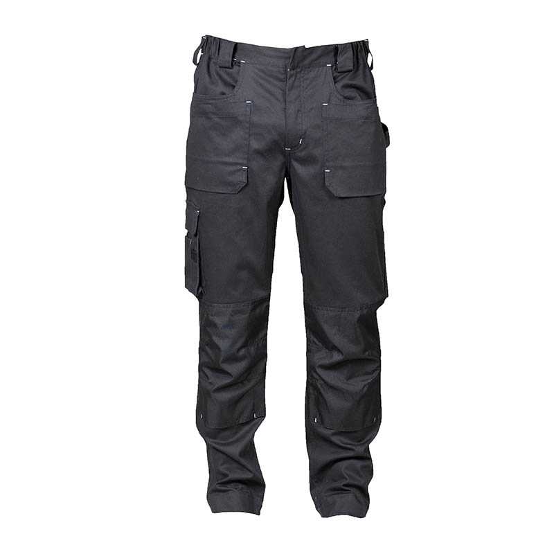 Front closure with zip and button Reinforced fabric at the back Reinforced fabric in the knee area Knee-height compartment for knee pads with Velcro closure Double reinforced topstitchin