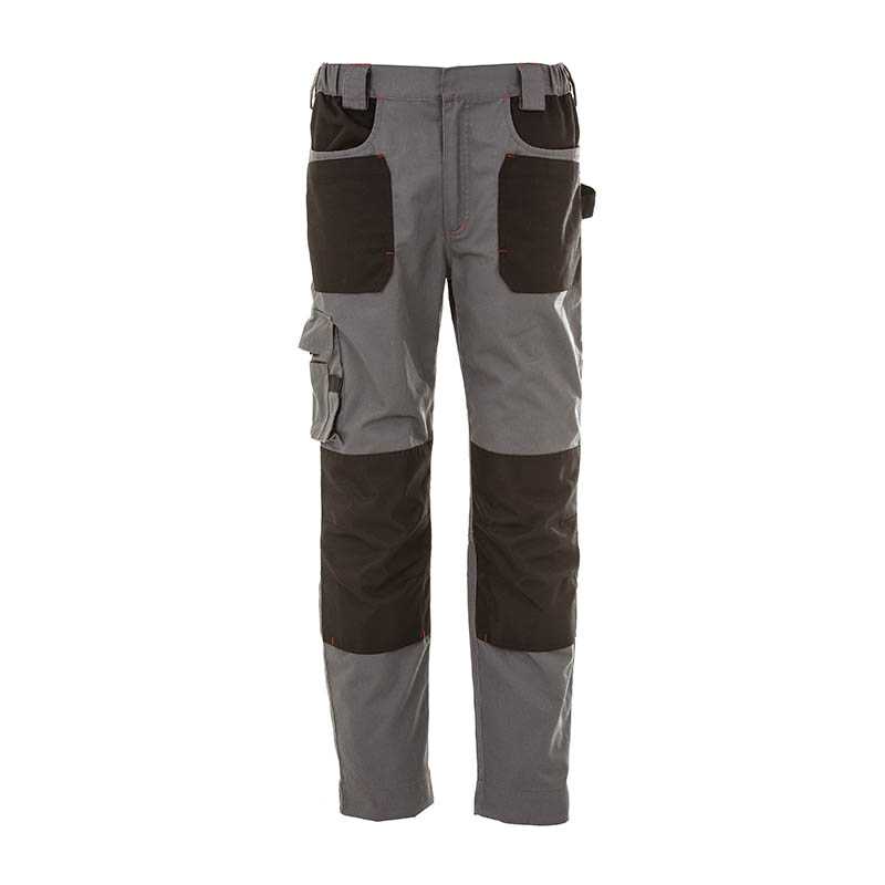 NOVINKA 2025. Elastic multi-pocket trousers - Main fabric in 65% polyester - 33% cotton - 2% elastane - Stretch anti-abrasion fabric 92% polyester - 8% elastane on the knees with contrasting stitching - Triple stitching - Two front zip pockets with reflective tape - One side pocket with zip - One open back pocket - One rear zip pocket with reflective tape - Double side pocket for tools or ruler - Hammer holder hook - Elastic waist on the hips and increased loops - PVC key ring or badge holder hook - Covered snap button at waist