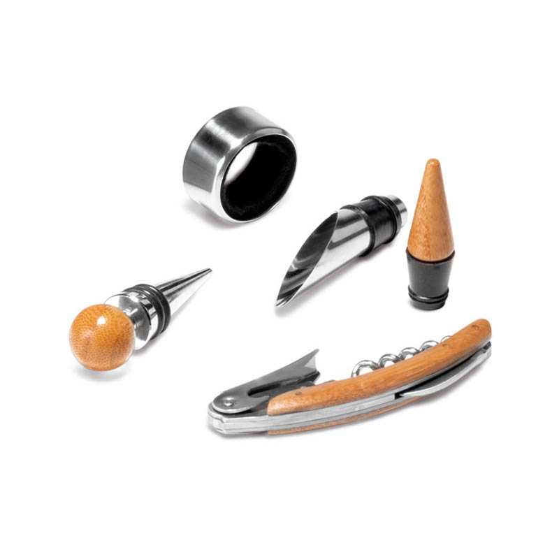 Súprava na víno z bambusu, zinku a nerezovej ocele. Obsahuje vývrtku so someliérskym nožom, krúžok na fľašu, zátku a lievik. 363 x 112 x 119 mm
