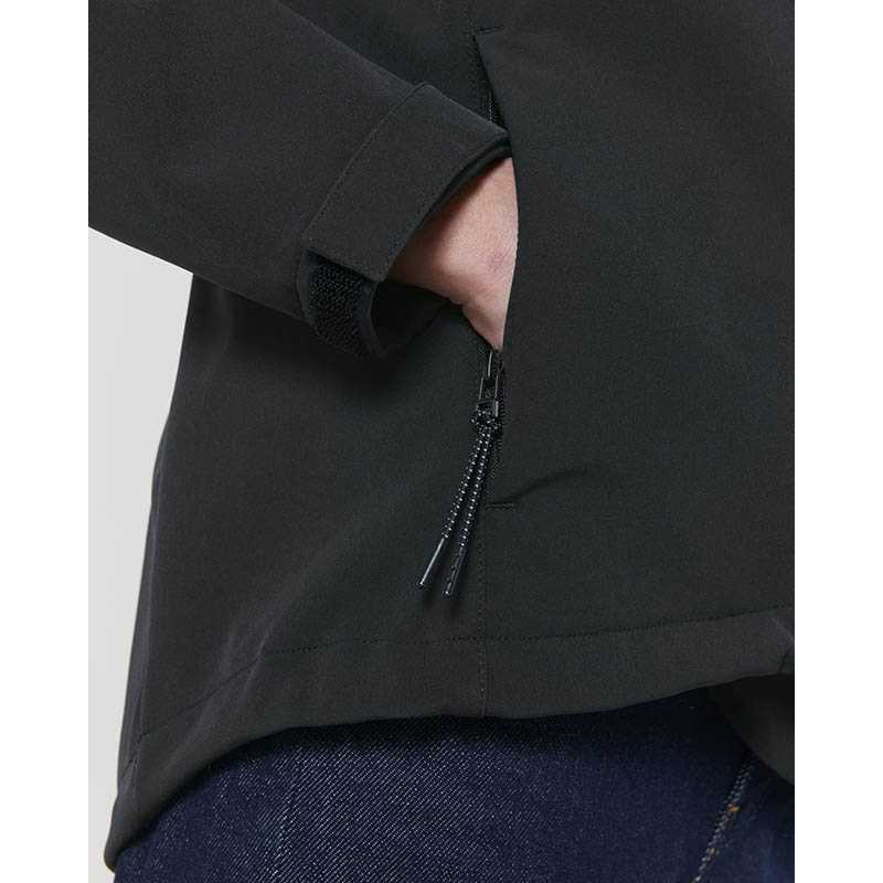 Softshell jacket 3 layers, waterproof and breathable - 97% polyester - 3% elastan - Waterproof 6000 mm/H2O - Breathability 4000 g/M2/24h - Thermic lining inside the front part - Reflective printing on front and back side - Raglan sleeves - Detachable padded-hood with drawstring - Laser cutting zip - One chest pocket with zip - Two pockets with zip - Inner wallet pocket - Elastic cuffs with velcro closing - Drawstring at the bottom