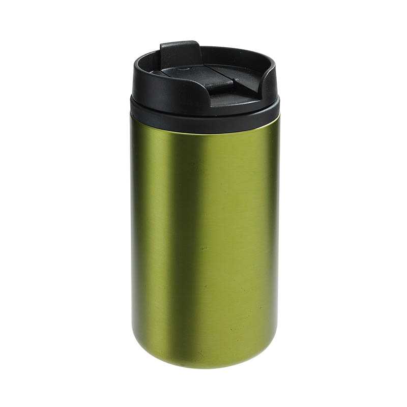 Stainless steel thermos cup (300 ml), double walled. The outer wall is stainless steel, the inner wall is plastic. The screw-on lid is leakproof and has a drinking opening with cap. The bottom of the cup is anti-slip. We do not recommend laser engraving o