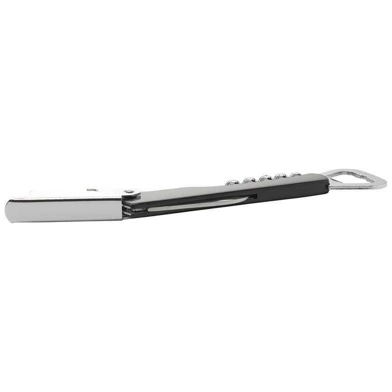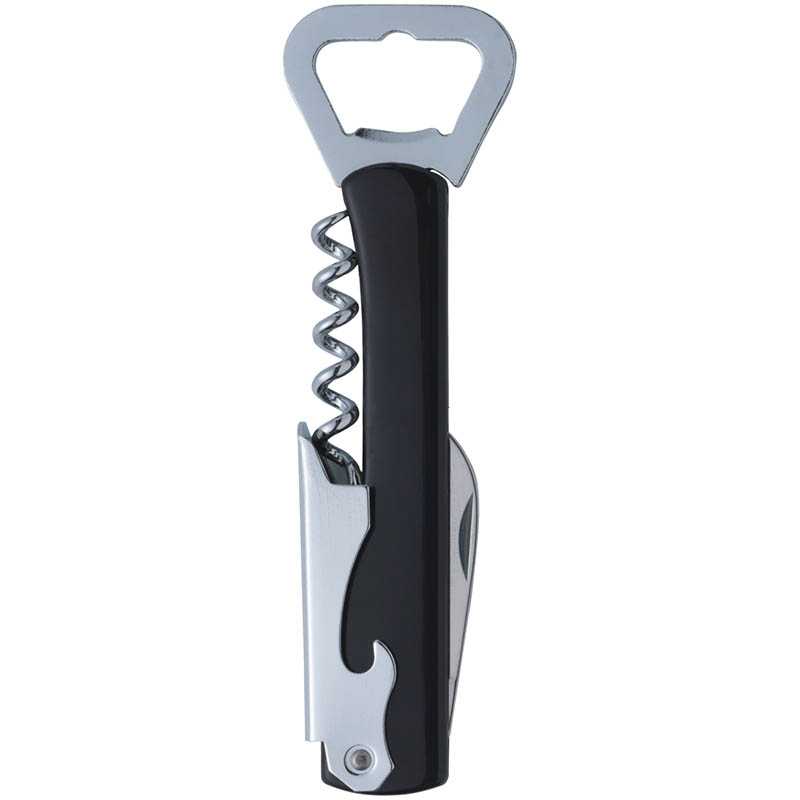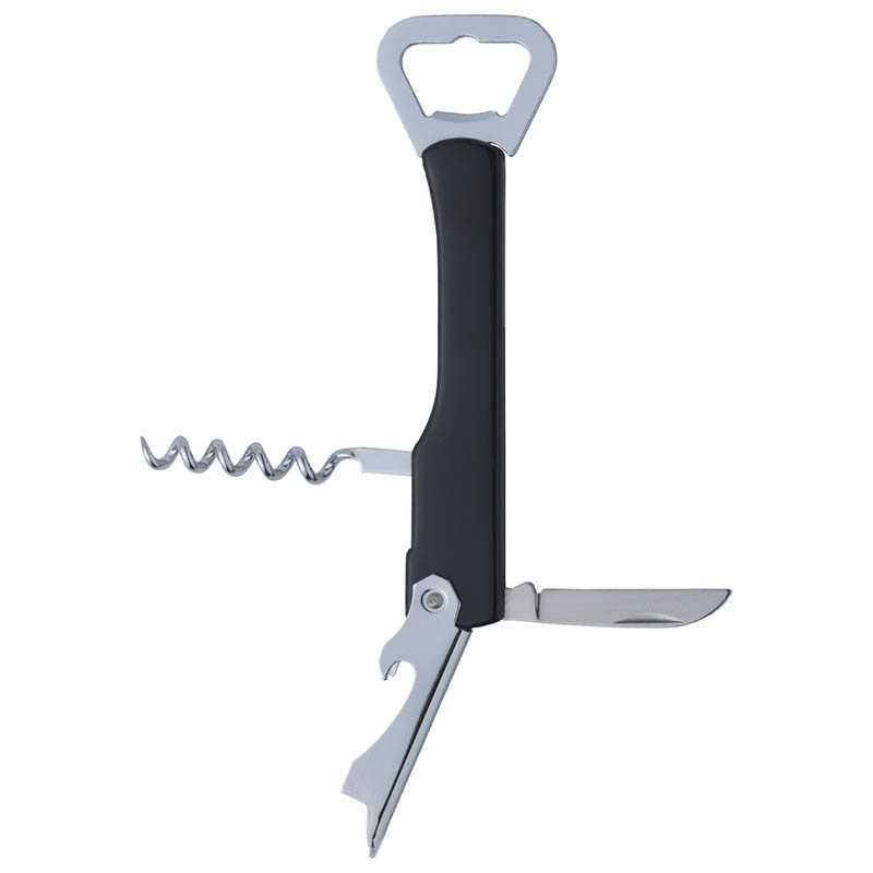Metal, folding waiters knife with ABS handle and 4 functions: corkscrew, 2 bottle openers, foil cutter. Each piece in a box.