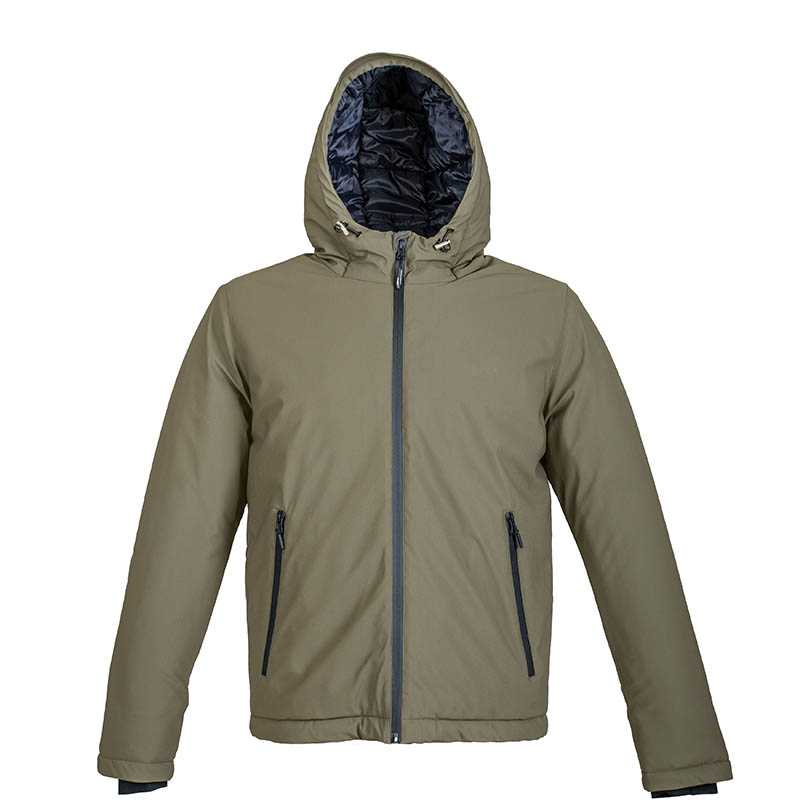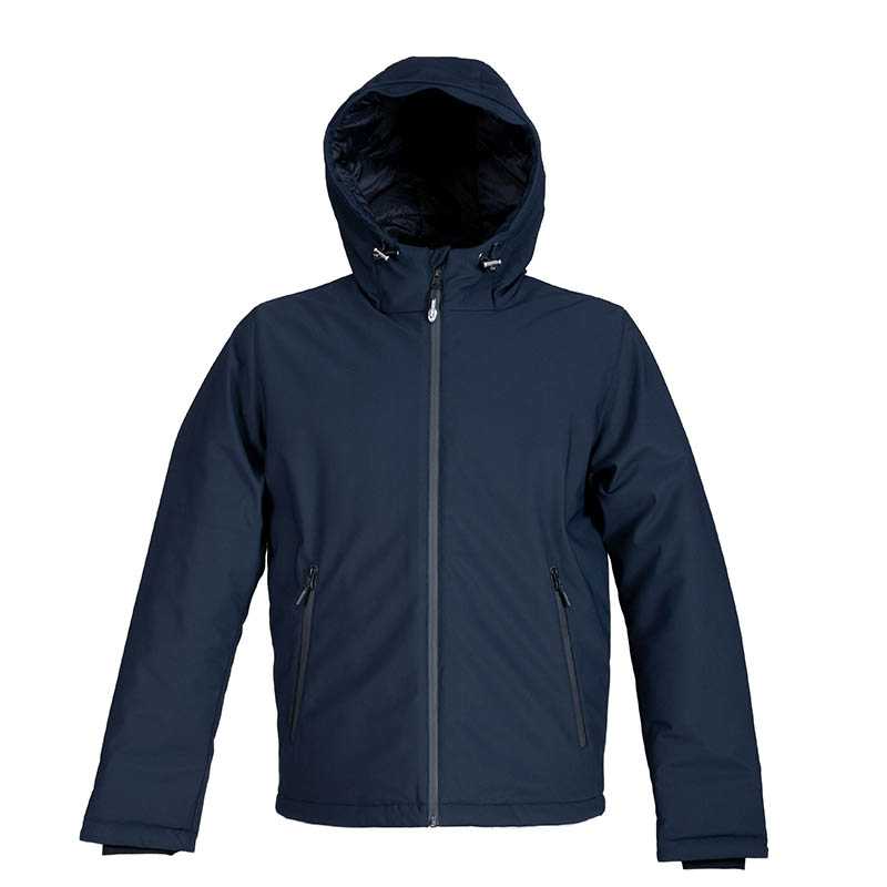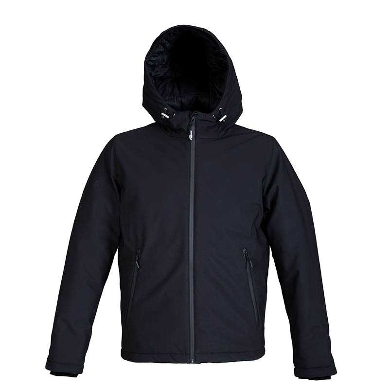 Waterproof composite fabric jacket - Shoulders, lower torso, sides and bottom of the sleeve in 3-layer stretch softshell - Chest and back in 92% polyester - 8% spandex with TPU membrane - Soft 320T polyester lining - Waterproof 3000 mm / H2O - Breathability 1000g / m2 / 24h - Soft polyester padding (feather effect) - Padded hood with stretch fabric finish - Waterproof zippers - An external chest pocket with invisible zip (can also be used to embroider) - Two large external pockets with zip - One internal zipped wallet pocket - Stretch fabric on the wrists - Drawstring at the bottom