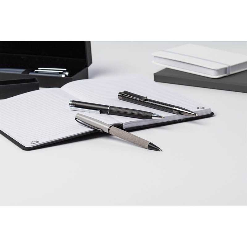 Kuličkové pero s tělem z recyklované nerezové oceli. Modrý inkoust. Dodáváno v černé dárkové krabičce.