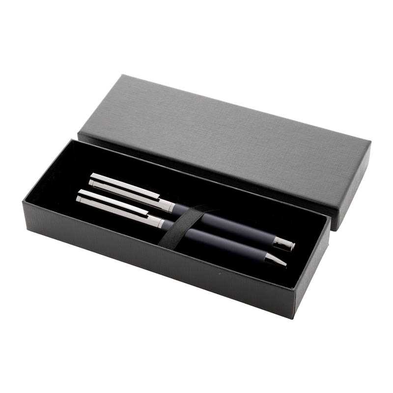 Sada pier s čiernou náplňou v darčekovej papierovej krabičke s magnetickým uzáverom. Sada obsahuje keramické pero a guľôčkové pero s gumovým povrchom.