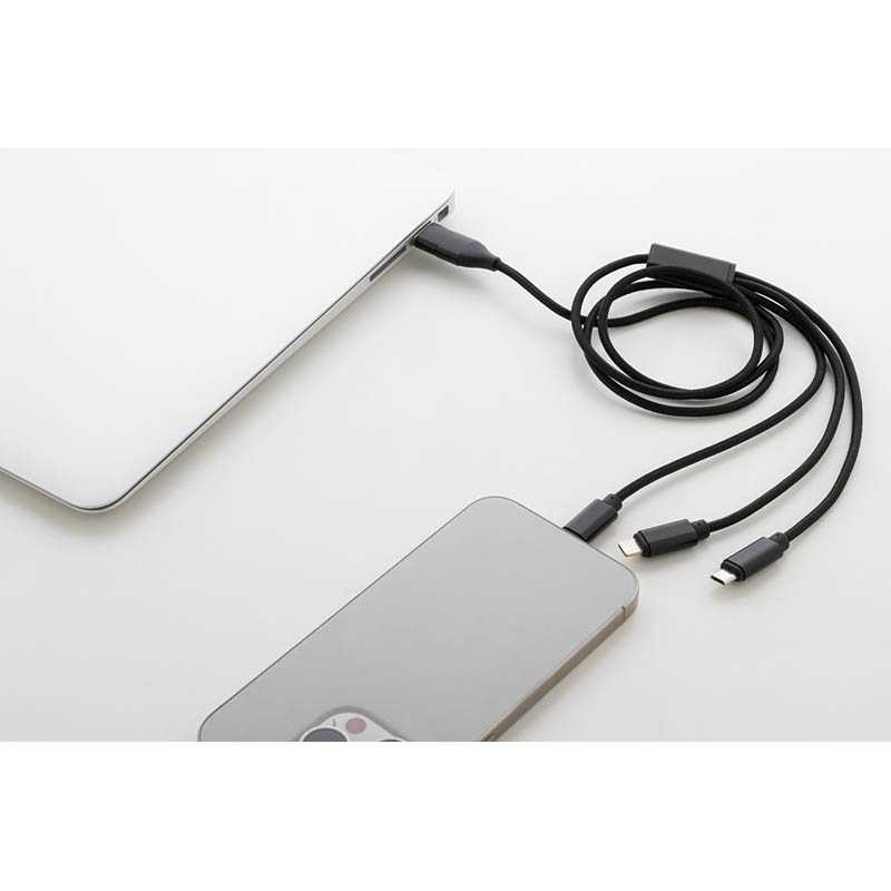 NOVINKA 2025. Přívěsek na klíče a nabíjecí 60W kabel s funkcí stojánku na telefon. Kryt z recyklovaného ABS. Vstup: 2v1 Type-C a Type-A. Výstup: Type-C a micro-B (2v1 kolíku). Délka kabelu: 26 cm.