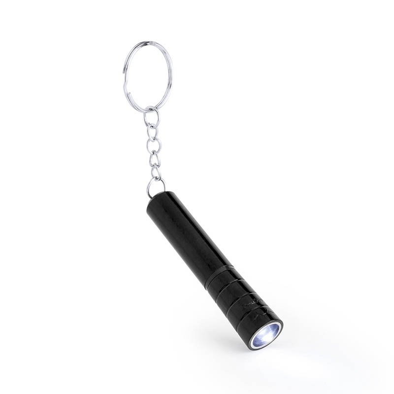 Plastová mini baterka s kovovým vzhľadom s bielym LED svetlom a kovovým príveskom na kľúče. Vrátane gombíkovej batérie.