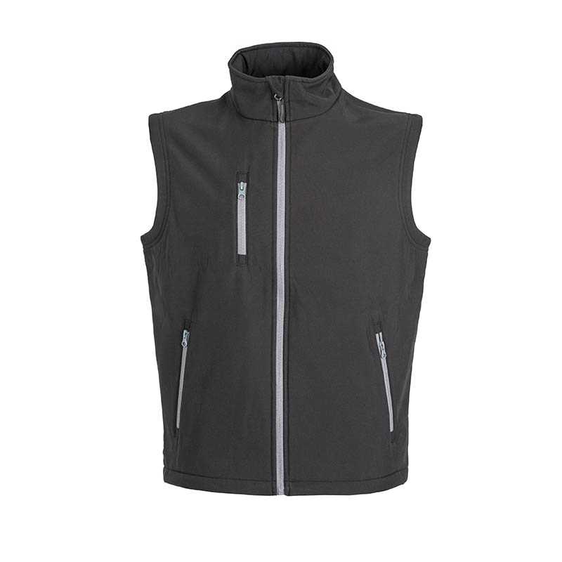 NOVINKA 2025. 3-LAYER SOFT SHELL VEST WATERPROOF AND BREATHABLE - 95% polyester - 5% elastane - Waterproof 8000 mm - Breathability 1000 - YKK taped zippers - Three external zip pockets - One chest pocket with triple pen holder and reflective reinforcement stitching - Reflective piping behind the neck - Central zip with internal windproof fabric - Chin protection fabric
