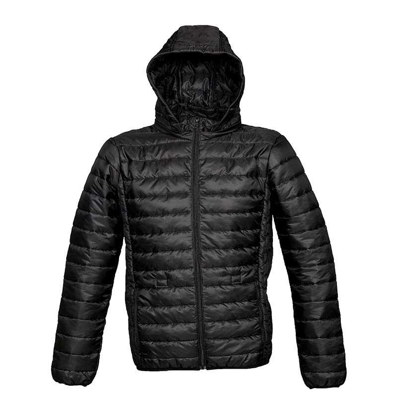 Quilted Hooded Jacket with Thermal Effect. Made of water-repellent flat weave outer Loft fabric, smooth inner lining and inner quilting for ensuring excellent thermal insulation through channels. Stand-up double layer collar with full-zip front closure including a chin guard for warmth and comfort. Straight-cut waist with adjustable elastic drawstring and stopper for a better fit and added comfort. Two vertical zippered waist pockets and an inner velcro pocket for a secure and convenient storage.Includes an inside back zip for easy marking with different methods: screen printing, embroidery, transfer printing, shields, vinyl application. Ideal as promotional clothing and casual wear.