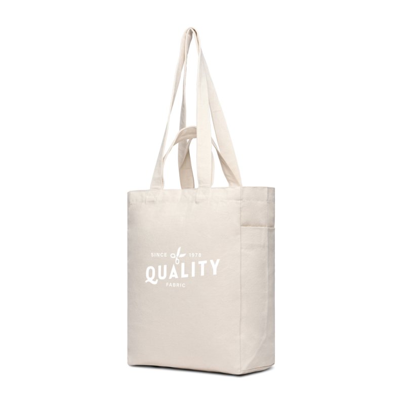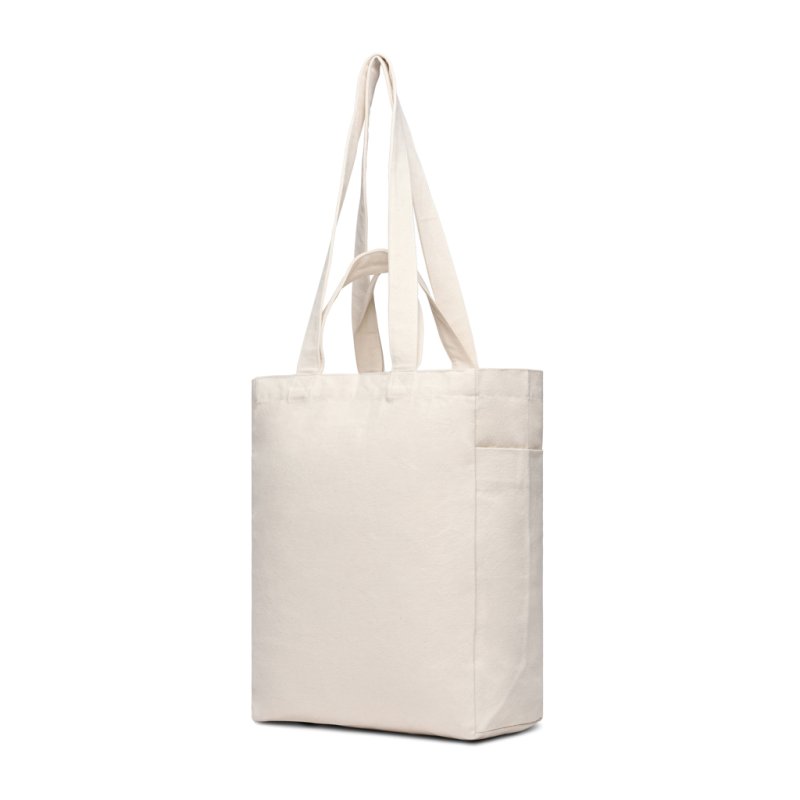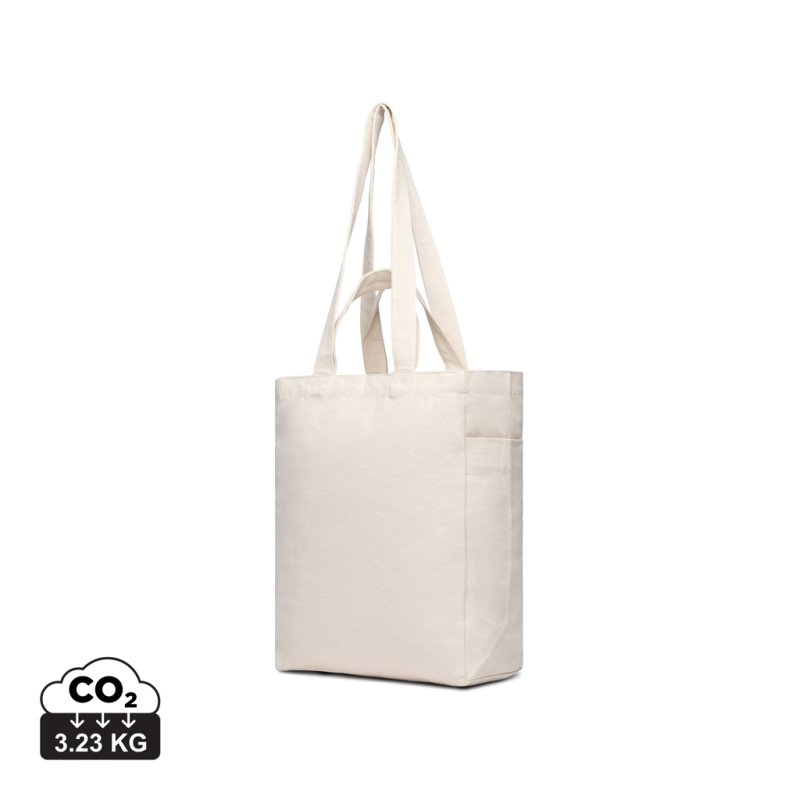 NOVINKA 2025. Taška kombinujúca pevné materiály a nadčasový dizajn. Kratšie uši na nosenie v ruke, dlhšie uši na nosenie na ramene. Dve otvorené vonkajšie vrecká. Vyrobené z recyklovaného nefarbeného plátna (canvas), ktoré bolo využité v jeho prírodnej podobe bez použitia bielidiel a chemikálií. Zloženie: 70% recyklovaná bavlna, 30% recyklovaný polyester. Vrátane skenovateľnej zložky AWARE™ garantujúcej obsah recyklátu. Z výťažku každého predaného produktu je navyše prispených 2% na podporu iniciatívy Water.org.