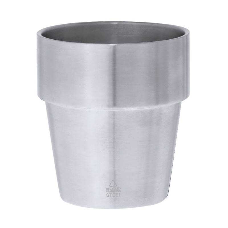 NOVINKA 2025. Thermal cup made from recycled stainless steel with double wall and 150 ml capacity. Exterior in satin finish and interior in stainless finish. Includes hermetic pressure closure transparent lid, with a dispenser and free of BPA. Ideal for having on your desk, table, or any surface where you can enjoy your favorite drink quietly. With recycled stainless steel logo.Stainless steel is one of the most demanded materials and can be found almost everywhere, from daily use products to large constructions. With countless properties, including durability and a high degree of reuse, making it a highly valued alternative in sustainability solutions. Properly treated, it allows for obtaining new resources of infinite use.