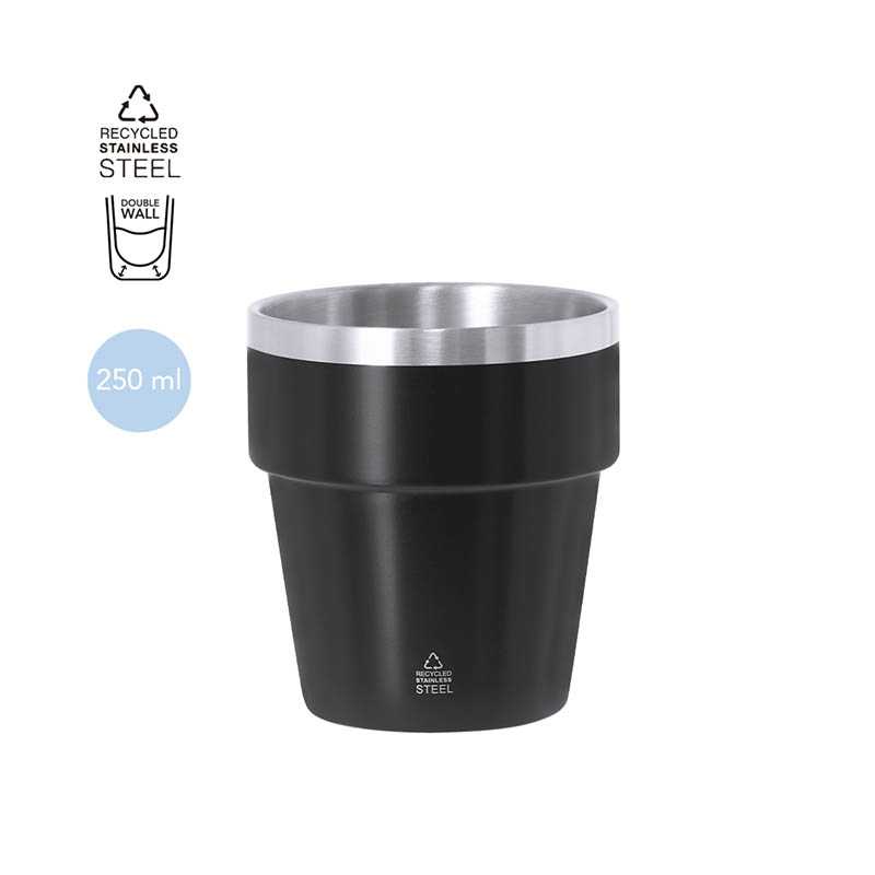 NOVINKA 2025. Thermal cup made from recycled stainless steel with double wall and 250 ml capacity. Coating in satin color and edge and interior in satin stainless color. With recycled stainless steel logo.Stainless steel is one of the most demanded materials and can be found almost everywhere, from daily use products to large constructions. With countless properties, including durability and a high degree of reuse, making it a highly valued alternative in sustainability solutions. Properly treated, it allows for obtaining new resources of infinite use.