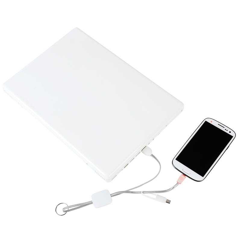 Charging cable ANNOUNCER: with 2 charging connectors to charge electronic devices and smartphones, length approx. 50 cm, with key ring, LED power indicator changes colour from red to blue once the charging process is either almost finished or the charging
